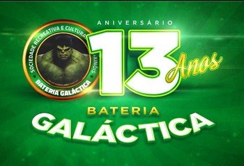 A Bateria Galáctica completa 13 anos e vai realizar uma festa para comemorar. Os comandados do mestre Alexandre preparam para o dia Sábado (11) um grande evento, a partir das 23h30min. no Palácio do Samba.