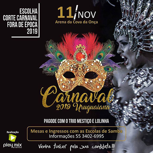 O Carnaval de Uruguaiana de 2019 terá sua esperada Escolha da Corte no dia 11 de novembro na Arena da Cova da Onça. Sob responsabilidade da produtora Playmix, este será o primeiro desafio frente ao grande público para a responsável pelos desfiles das escolas de samba da cidade que estão marcados para os dias 21, 22 e 23 de março.