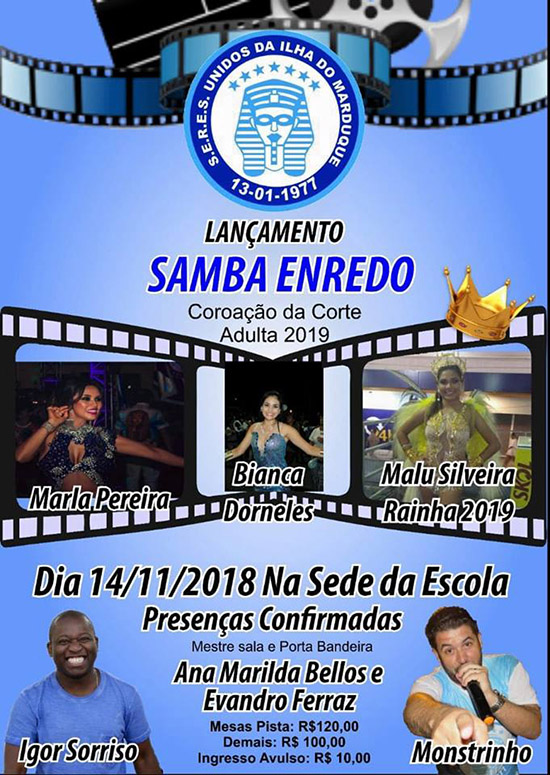 O intérprete Igor Sorriso é a atração principal da noite, que juntamente com Monstrinho e a harmonia da azul-e-branco vão embalar a quadra da escola. A BaterIlha Caldeirão do mestre Alexandre também dará uma amostra do que está por vir em 2019. O evento ainda vai ter coroação da Corte Adulta e apresentação do casal de mestre-sala e porta-bandeira Evandro Ferraz e Ana Marilda Bellos diretamente de Porto Alegre.