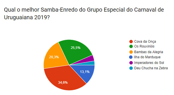 O Site SambaSul lançou uma enquete na semana passada perguntando "Qual o melhor Samba-Enredo de Uruguaiana?". O internauta teve 1 semana para dar sua opinião. Segue abaixo o resultado: