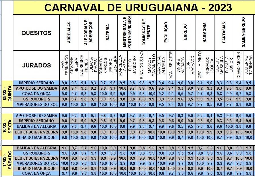 O site SambaSul teve acesso e disponibiliza, como em todos os anos, as justificativas das notas apresentadas pelos jurados do Carnaval 2023 de Uruguaiana.