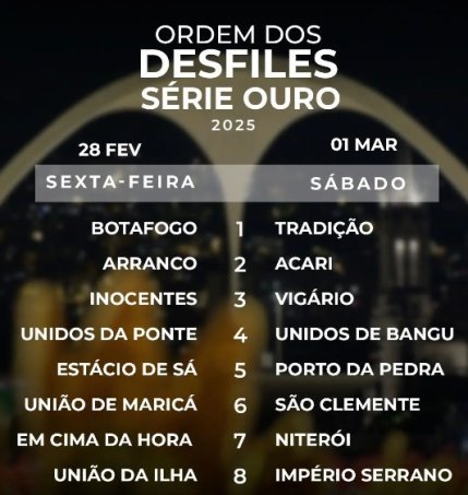 Foi realizado na noite desta terça-feira (18) o sorteio da ordem de desfiles da Série Ouro do Carnaval 2025 do Rio de Janeiro.